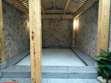 泉池為石砌,櫻花環繞