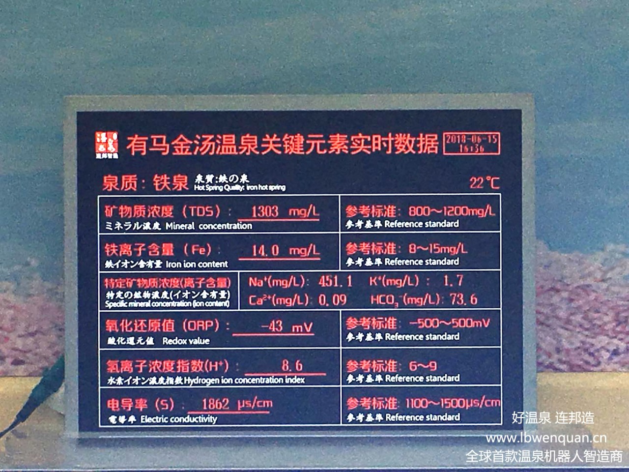 溫泉ORP(氧化還原電位)測試:是判斷真假溫泉的主要方法和標準,因為自來水是正電位,能量溫泉是還原態負電位,因此能夠有效抗氧化綜合自由基延緩衰老,促進細胞呼吸功能,有利于身體新陳代謝。溫泉設備氯是氧化性的,與還原系的溫泉是完全不同的性質,在天然溫泉加入氯后會起氧化作用,首先會中和溫泉的還原性,再呈現氧化性,最后才具有殺菌性, 這樣的溫泉內涵已由原先降低皮膚氧化及老化抑制的期待,轉變成身體浸泡在氧化皮膚、促進老化的環境,這已經完全喪失了傳統享受天然溫泉還原性特質的功能,這才是『真假溫泉判斷』的核心所在。