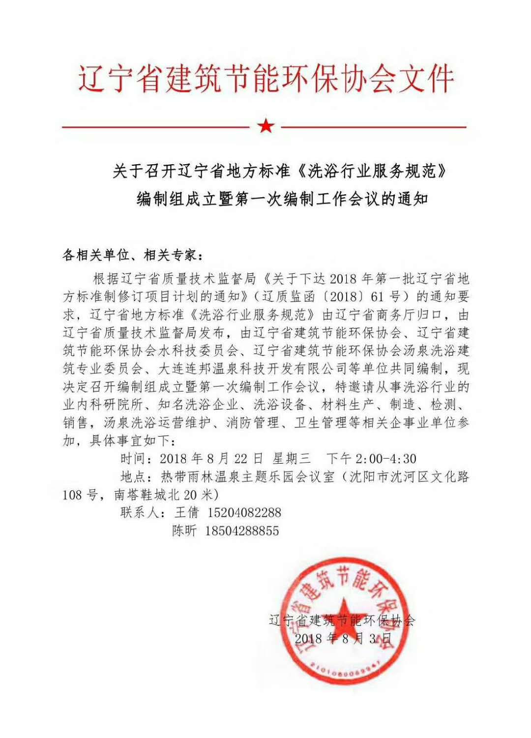 關于召開遼寧省地方標準《洗浴行業服務規范》編制組成立暨知名次編制工作會議通知: