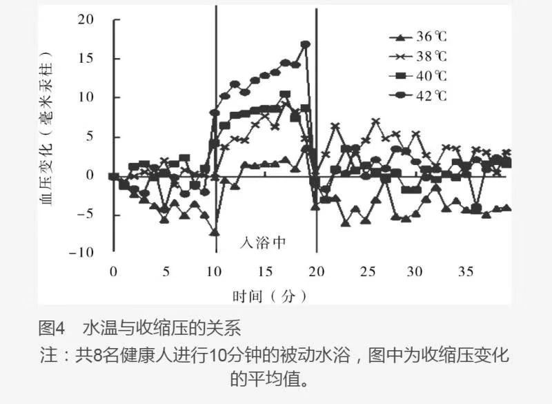42C以上的高溫浴會引起交感神經(jīng)系統(tǒng)緊張,不論是在精神上還是肉體上都使人處于活躍狀態(tài),人浸泡在42℃的熱水里10分鐘,血壓會比入浴前增加20~40毫米汞柱左右,這是由于交感神經(jīng)受熱水刺激引起興奮,導(dǎo)致血管收縮及血壓突然上升所致。脈搏每增加40次,體溫也隨之升高2℃左右(見下圖)。
