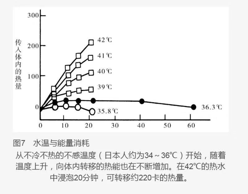2、水溫與能量的消耗正常人入浴所消耗的熱量為每分鐘、單位體重的0.0606卡路里,一個體重60千克的人入浴20分鐘,消耗熱量為73卡路里,但這個計算忽略了水溫的影響。高溫浴會使交感神經(jīng)興奮而增加活動量,熱量消耗也會有所增加。在42℃的熱水中浸泡20分鐘,約有220卡的熱量進(jìn)入人體內(nèi),40°時約有110卡,39°C時約有50卡隨著體溫的上升,基礎(chǔ)代謝量也會增加,這會消耗更多的能量。36℃的不感溫浴幾乎沒有能量進(jìn)出身體(見下圖)。