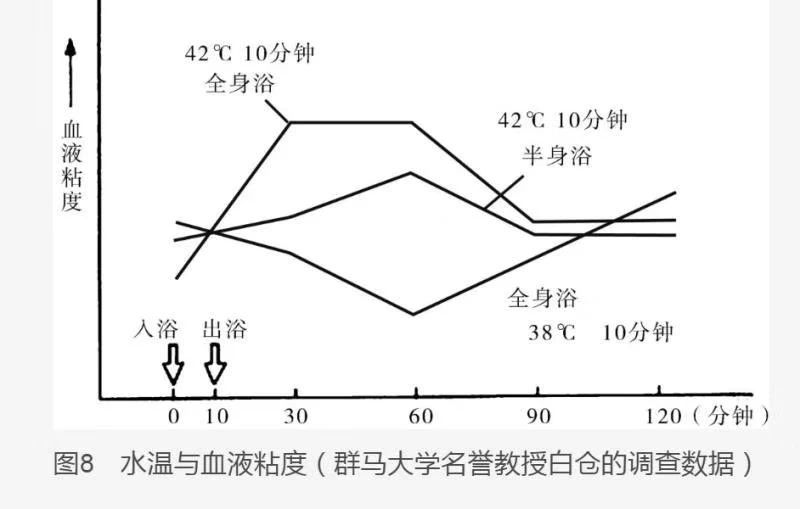 高溫浴的另一個危險性是使血液粘度上升。進(jìn)行42℃的全身浴時,血液黏度開始明顯上升。將抽血后的針管倒置,血液會從針頭滴下,高溫浴后的滴下速度會明顯變慢。然而,38℃的微浴時的血液黏度不升反降。進(jìn)行42℃的高溫浴,如果水位浸到胃部附近,血液粘度則上升極少。